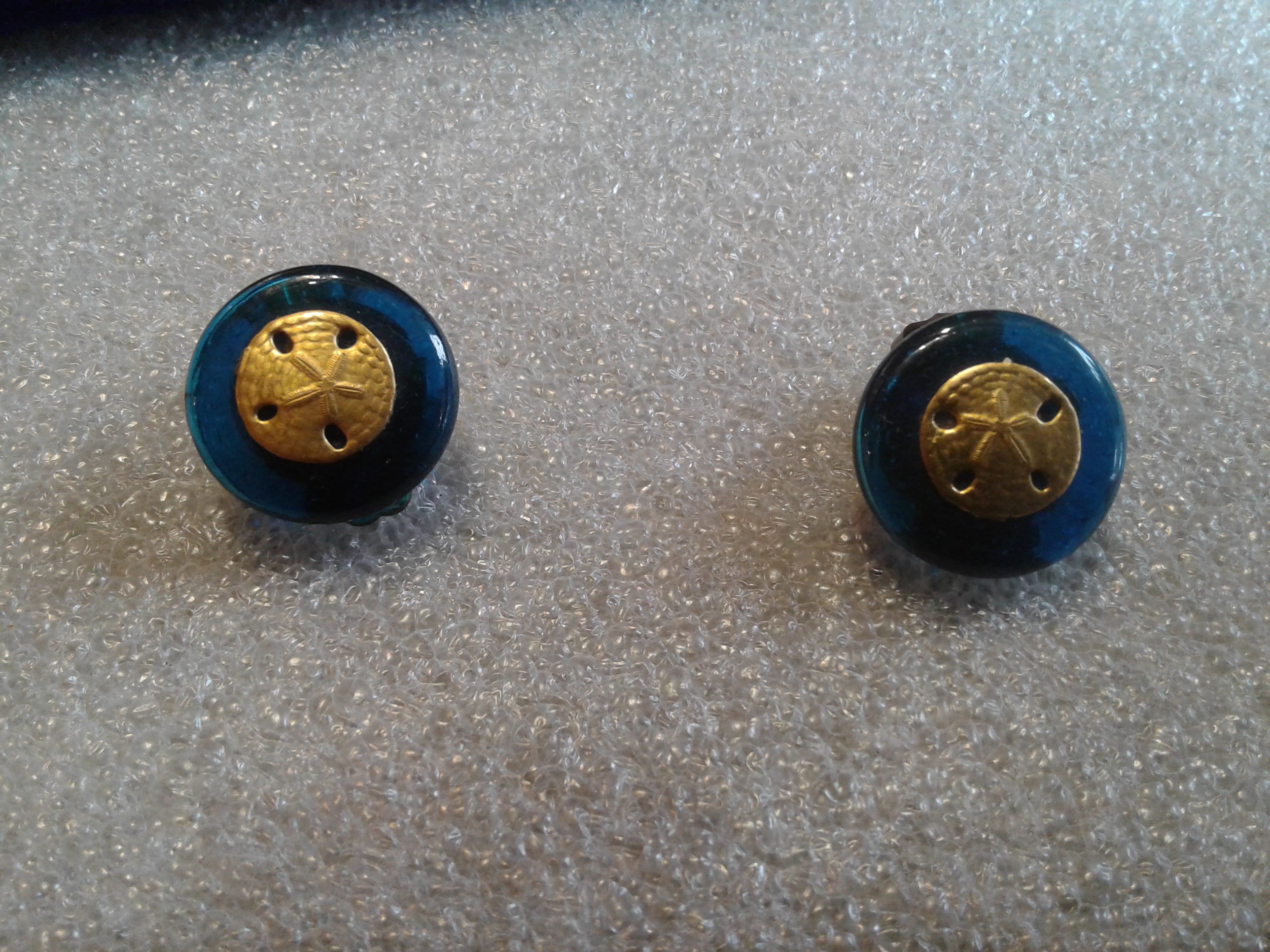 Nice little buttons of blue glass with matte goldtone sand dollars glued on top. Clip on fasteners. Metal has darkened on fasteners, but not on tops. Likely 1960s, could be later. B105